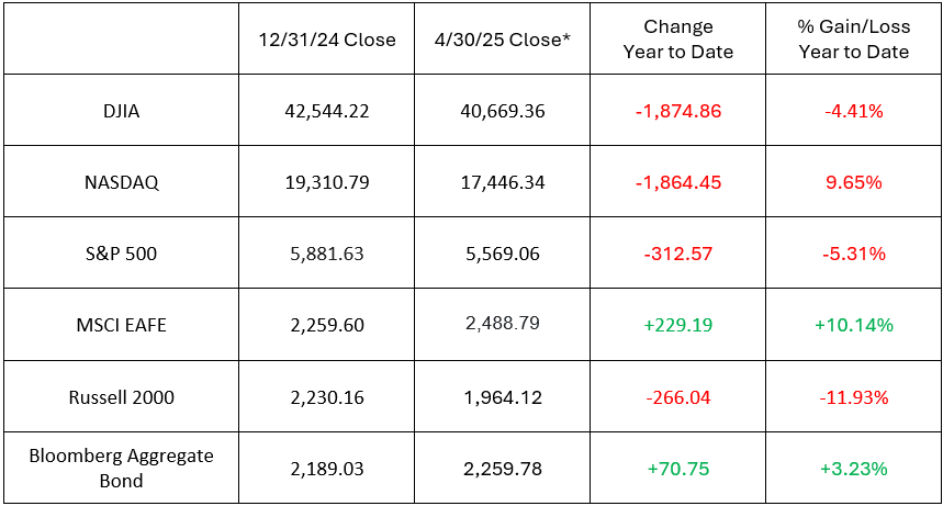 *Performance reflects index values as of market close on April 30, 2025. Figures for the MSCI EAFE and Bloomberg Aggregate Bond reflect the market close on April 29, 2025.