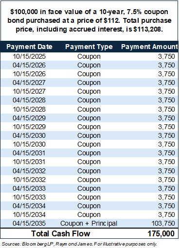 A bond priced at a premium does not mean that it is expensive or that it will lose the investor money; it simply means that its coupon is higher than its yield. All else being equal, it provides the investor with higher levels of coupon cash flow than lower-priced bonds. By paying more up front, an investor is purchasing more coupon cash flow over the life of the bond. To highlight the buying-a-bond-at-a-premium-doesn’t-mean-you-will-lose-money theme of this commentary, the illustration to he right walks through the lifetime cashflow provided for a bond purchased at a premium.