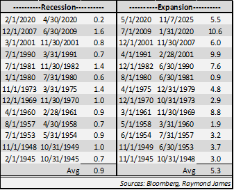 The last 13 recessionary and expansionary periods are detailed in the chart. The average length of a recessionary period during these 80 years was 0.9 years, with the longest one, the Great Recession, spanning from December 2007 to June 2009 (1.6 years). Expansionary periods have lasted longer, averaging 5.3 years over the same time.